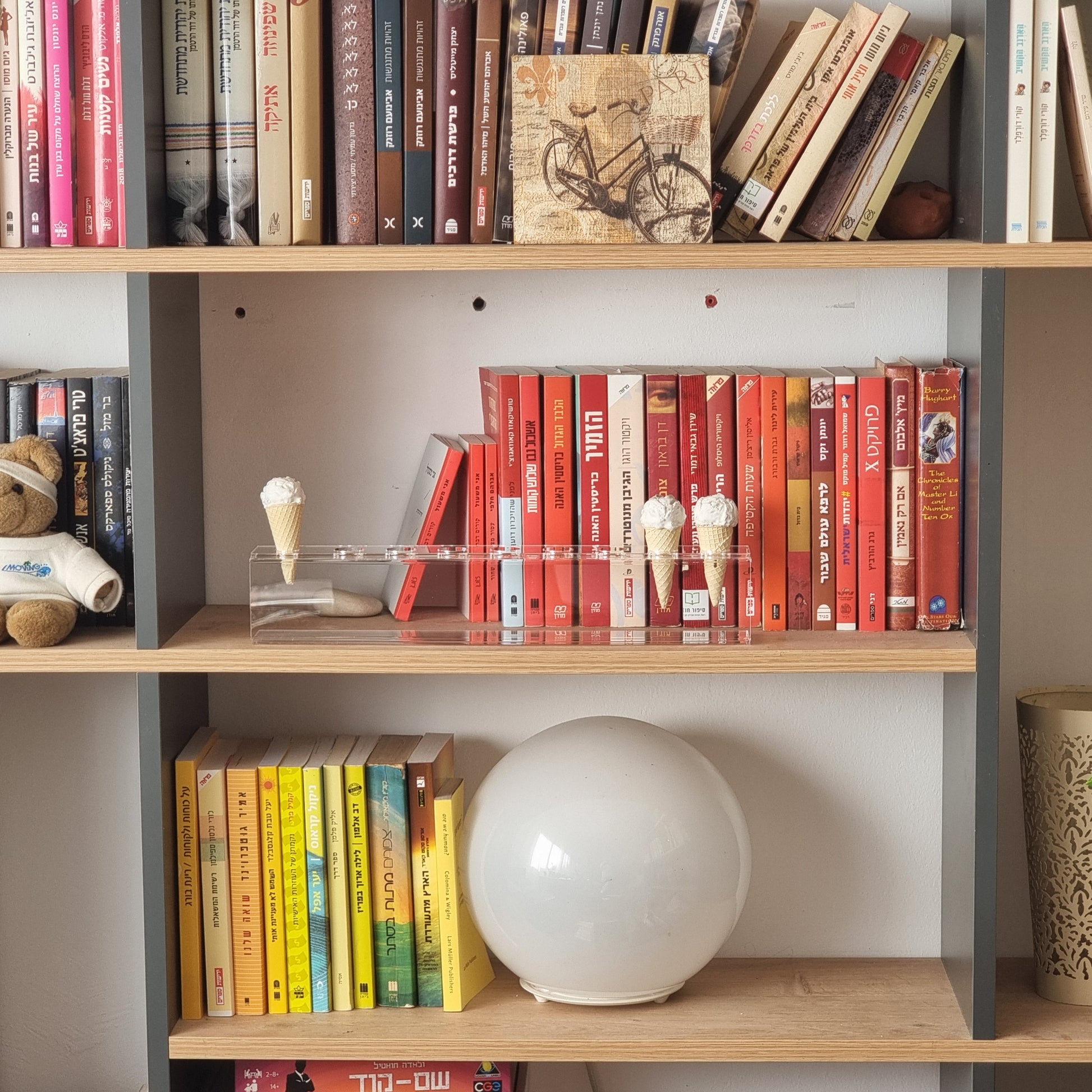 The “floating” look of the ice-cream cones gives the menorah a visually elegant appearance, suitable for display in a living room or guest area. At the same time, its use is playful and interactive: arranging the cones on the acrylic stand, lighting the candles with the shamash placed inside an ice-cream cone, and choosing candle colors—which will become the “ice-cream topping” color as the wax drips!